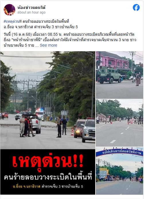 เมื่อเวลา 08.55 น. ของวันนี้ (16 ต.ค. 68) เพจเฟซบุ๊ก เกาะติดNews เกิดเหตุคนร้ายไม่ทราบจำนวน ลอบวางระเบิดเจ้าหน้าที่ตำรวจ สถานีตำรวจภูธรยี่งอ ขณะออกปฏิบัติหน้าที่รักษาความปลอดภัยเส้นทาง บริเวณหน้าร้านน้ำชาพี่นี ริมถนนสายหลักในพื้นที่ อ.ยี่งอ จ.นราธิวาส เบื้องต้นส่งผลให้เจ้าหน้าที่ตำรวจได้รับบาดเจ็บ